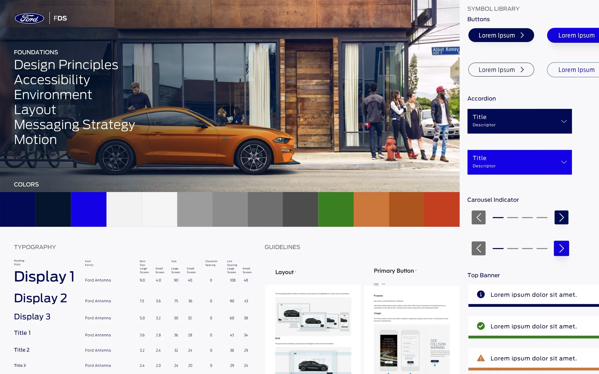 We began not with components but with meaning. Ford’s brand pillars—freedom of movement, human focus, engineering grit—were stripped down to color values, typographic rhythms, animation principles, even the weight of a click-sound. Those elements became the alphabet of a design language we called the Ford Design System, or FDS.