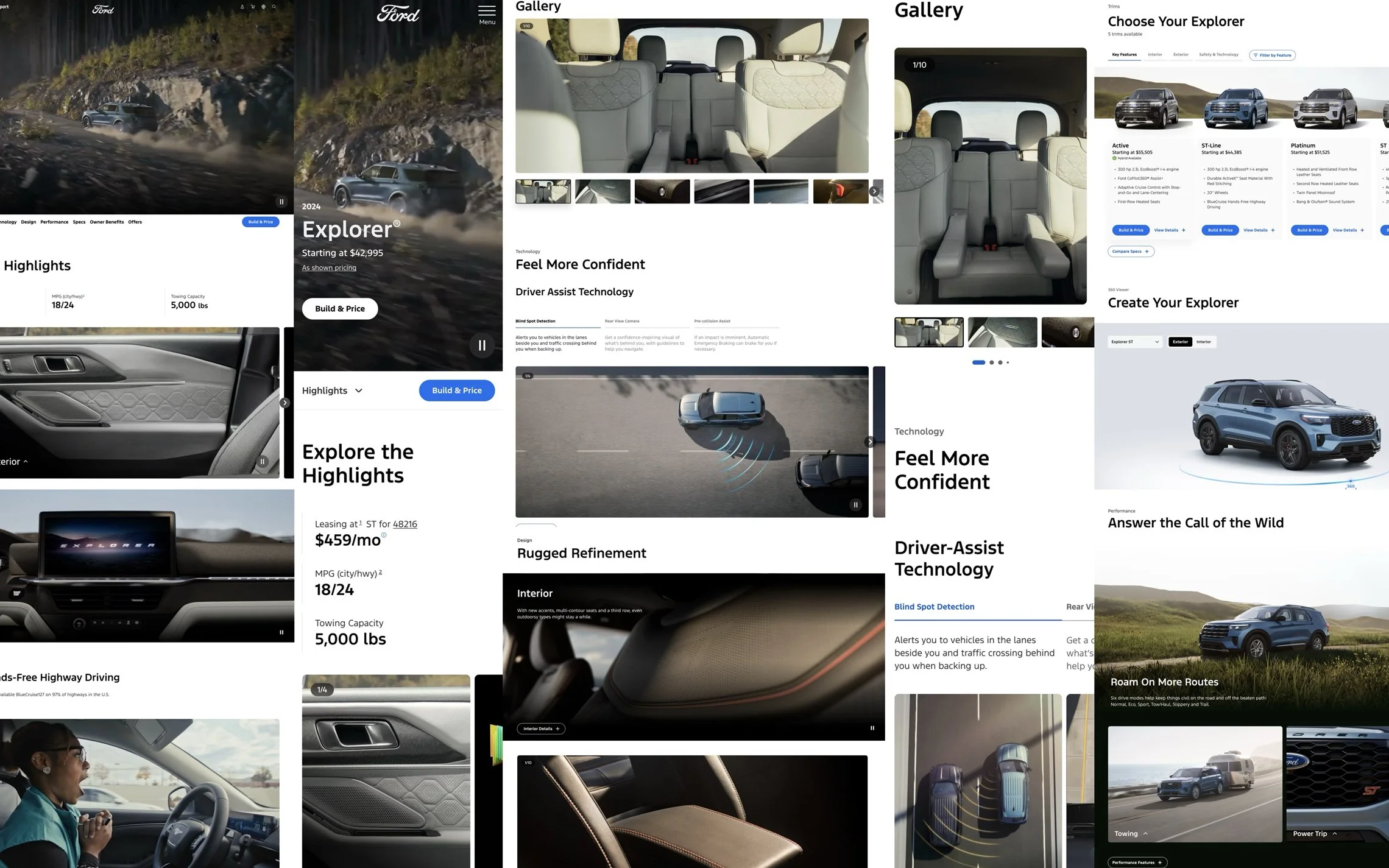 Directed the creative for Ford's next-generation web platform — reimagining the site as a fluid commerce experience where discovery, configuration, financing, and ownership converge. Using the Explorer as the flagship proving ground, visual hierarchy was designed to guide the eye from hero imagery straight to action — build, price, reserve. Navigation, spec comparison, and checkout were compressed into the fewest possible clicks. Content was rewritten to feel like guidance, not pressure.